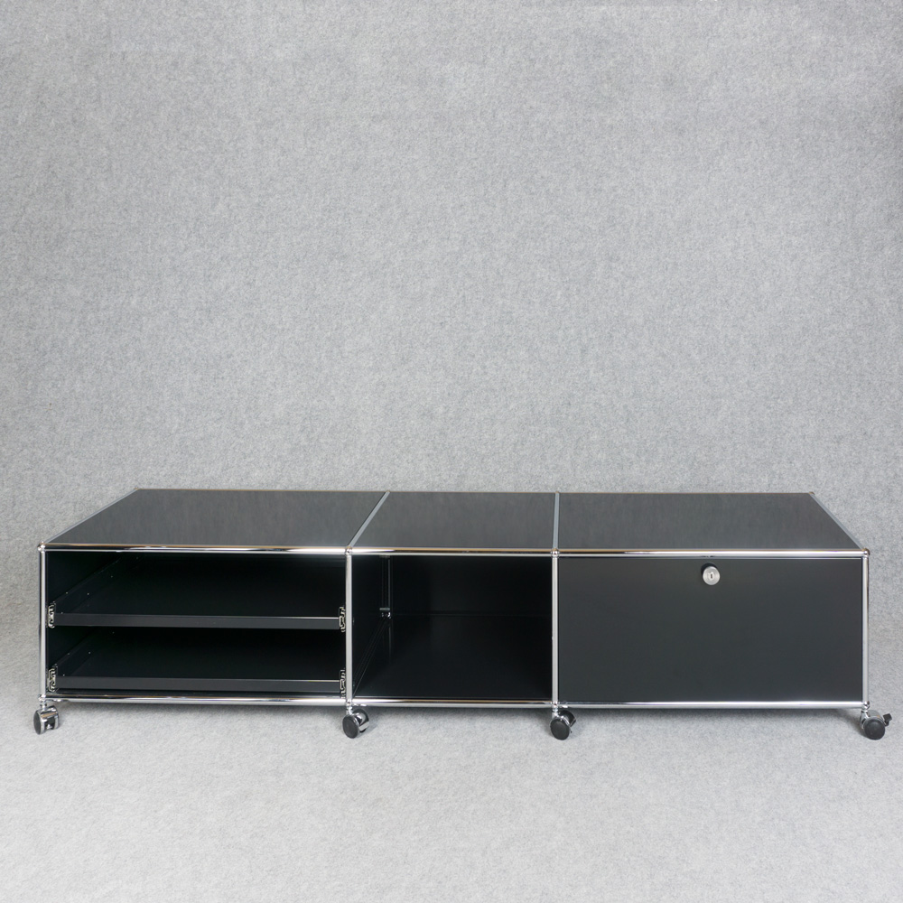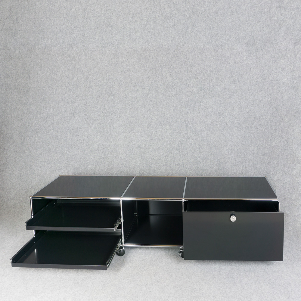 USM Haller Lowboard mit zwei Ausziehtablaren und einer Ausziehtür mit Einlegerahmen. Zeitloses Design sowie langlebige Materialwahl.