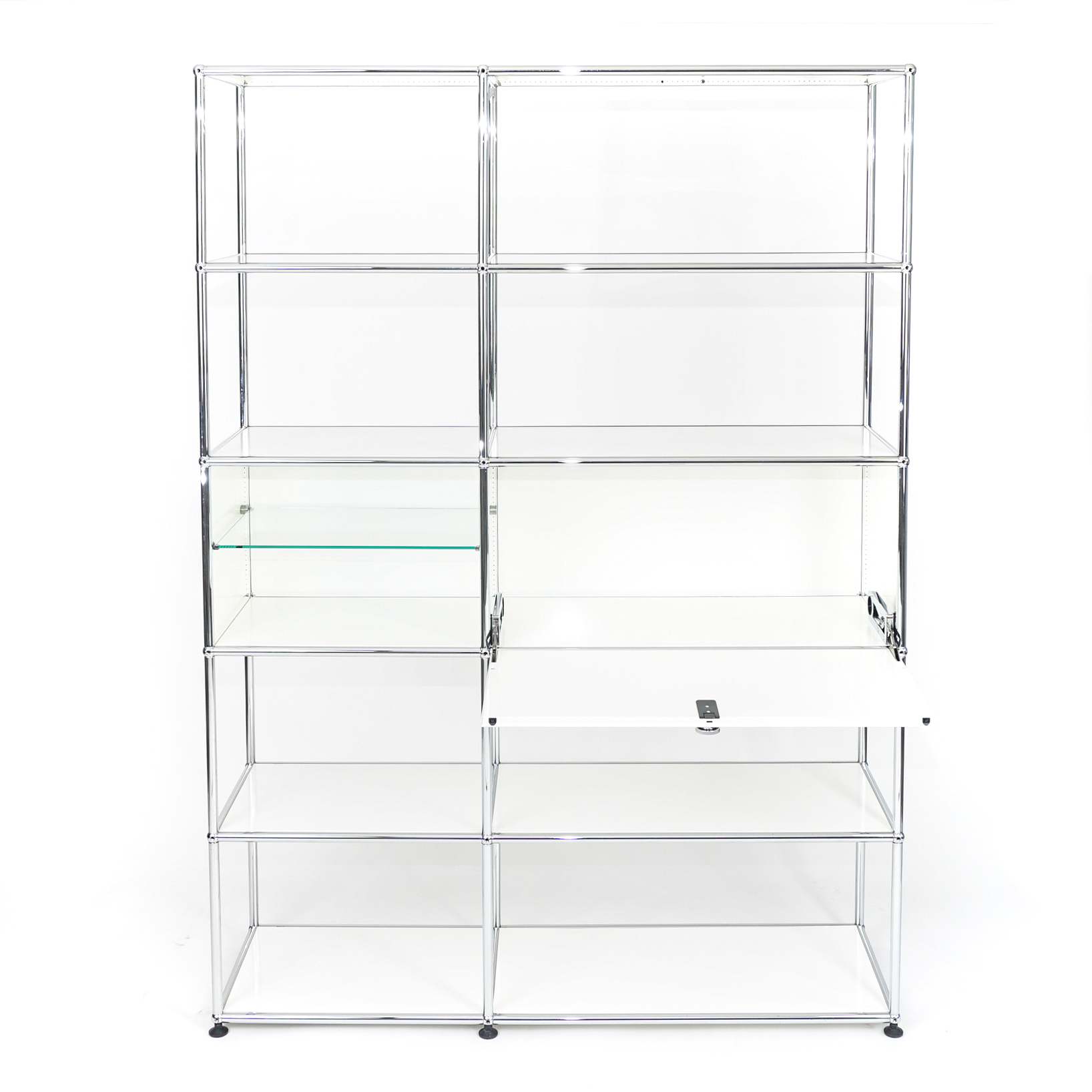 USM Haller Regal mit einer Klapptüre und einem Glas-Zwischentablar. Zeitloses Design sowie langlebige Materialwahl.